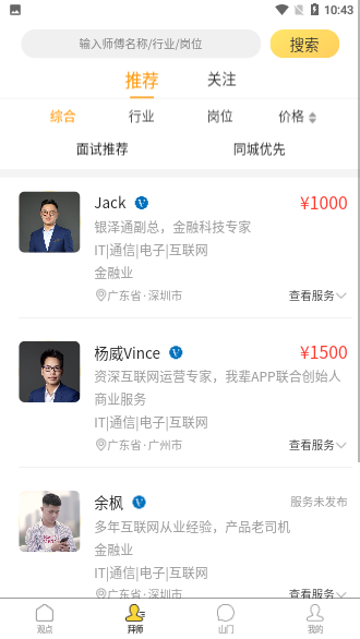 拜師:專家肩膀上看問(wèn)題,節(jié)省大量低效率摸索,師傅一句話,勝讀十年書(shū);隨時(shí)為用戶提供職場(chǎng)知識(shí)、經(jīng)驗(yàn)分享服務(wù)。從求職兼職、職場(chǎng)晉升、溝通技巧、學(xué)習(xí)方式到團(tuán)隊(duì)管理,KPI制定等問(wèn)題,都有對(duì)應(yīng)的牛人師傅幫助用戶解決。