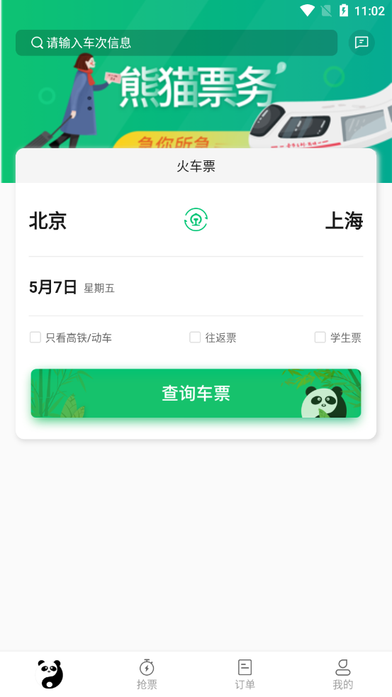 熊貓票務(wù)app,多平臺(tái)的出行服務(wù)軟件。熊貓票務(wù)為用戶(hù)提供鐵路、航空、汽車(chē)等全票務(wù)出行訂票功能,出行放心,尊享體驗(yàn),還有專(zhuān)屬商旅服務(wù)提供,出行隨心,個(gè)性化定制,急你所急,快速出票。