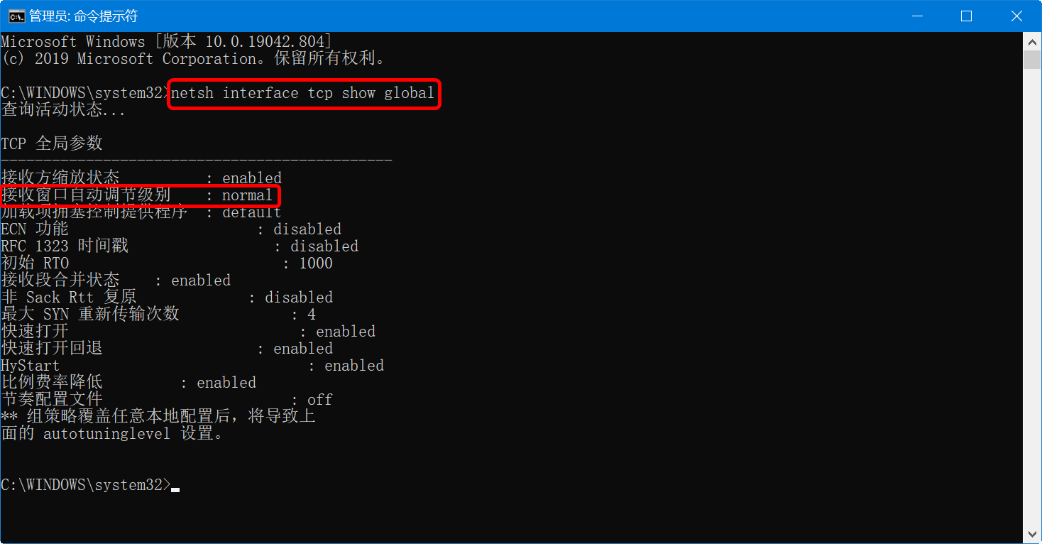 2、輸入命令 netsh interface tcp show global, 按Enter回車鍵查看到電腦網(wǎng)絡(luò)配置。這里,我們要將接受窗口自動(dòng)調(diào)節(jié)級(jí)別關(guān)閉(系統(tǒng)默認(rèn)是normal)來增大網(wǎng)絡(luò)流量;
