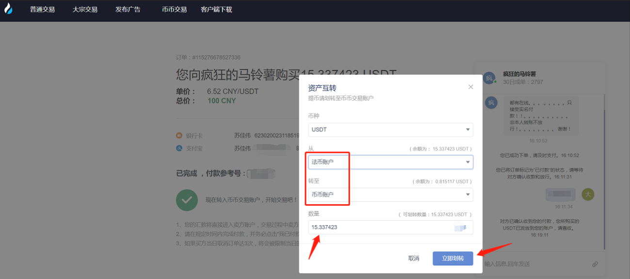 第一步,當你在法幣交易站完成一筆交易后,在訂單完成界面下方可以看到:“立即劃轉”。