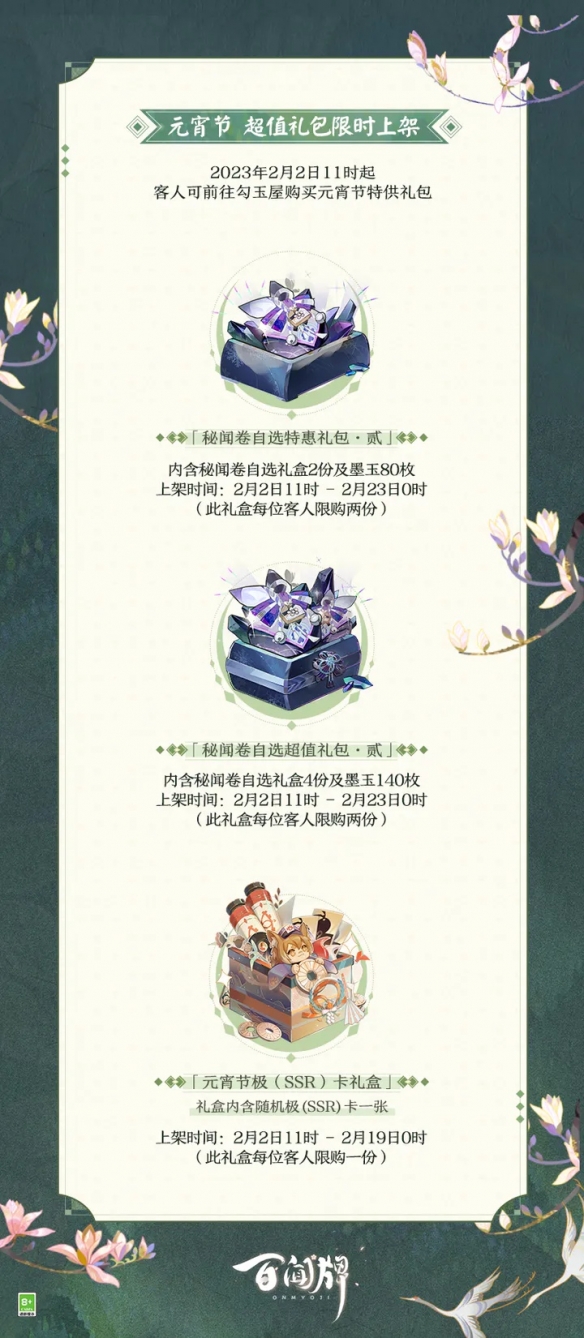 勾玉屋上新,三款元宵節(jié)特供禮包「秘聞卷自選超值禮包·貳」、「秘聞卷自選特惠禮包·貳」及「元宵節(jié)極(SSR)卡禮盒」即將同步上架!