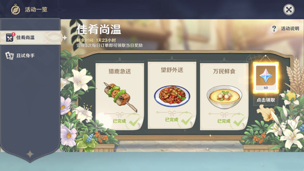 以上內(nèi)容就是小編整理的關(guān)于原神佳肴尚溫第六天任務(wù)的全部?jī)?nèi)容,佳肴尚溫任務(wù)一共持續(xù)七天,明天之后佳肴尚溫就要和大家說(shuō)再見啦!玩家們珍惜最后兩天在原神世界里當(dāng)外賣員的日子吧!