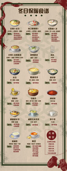 冬季保暖食譜:正是寒冷的冬季,幸存者們?cè)诙蜒┤说臅r(shí)候可不要忘記保暖哦。鵝鵝給大家整理了冬季保暖菜單,助大家度過(guò)嚴(yán)寒的末世。有了這個(gè)食譜,媽媽再也不用擔(dān)心我會(huì)感冒。
