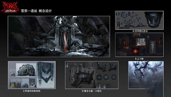 4.在設(shè)計風(fēng)格上,設(shè)計也秉持了自雪原設(shè)計之初而設(shè)定的“陰冷”這一設(shè)計方向。因此,在本場景中,大量的暗色與冷色渲染便成為烘托氣氛的主力,極少的暖色卻反而更加強化了“陰冷”這一概念帶給玩家的“肅殺之感”。加之軸對稱的冷暖設(shè)定,更在此“肅殺”之上包裹一種“恐懼”的感覺。因此,在強大的敵人面前時,玩家將更有面對怪物想要勝利的戰(zhàn)斗意志。