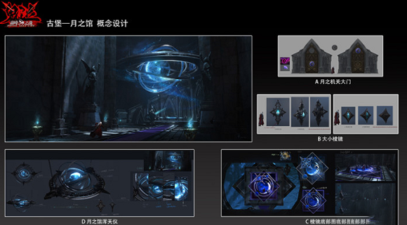 而在古堡內(nèi)部,畫風(fēng)似乎卻陡然一轉(zhuǎn),將外觀上那種“恢弘式的恐懼”之感全部拋盡,轉(zhuǎn)而以“幽暗寂靜”來傳達(dá)戰(zhàn)斗即將發(fā)生這一信息。在月之館內(nèi),場景以漸染的藍(lán)與黑裝點,同時,充滿著古樸花紋的棱鏡以及神秘復(fù)雜的圖案更將這一部分場景的幽暗神秘表現(xiàn)了出來。而為了能夠制作“渾天儀”這一模型,設(shè)計師更是認(rèn)真研究了“渾天儀”的具體構(gòu)造,并在查明典籍的情況下再多方詢問才放心地制作出了月之館渾天儀的模型,這一切都是為了能帶給玩家非同一般的體驗。