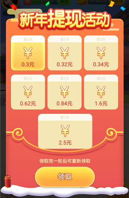 3、參與新年提現(xiàn)活動(dòng),就可以進(jìn)行領(lǐng)取,領(lǐng)取完一輪之后還能夠重新進(jìn)行領(lǐng)取。