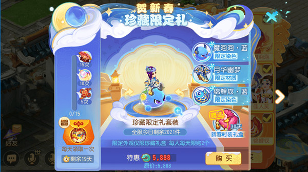 賀新春,換新裝!春節(jié)限定珍藏禮盒將于2月1日10點(diǎn)在再續(xù)前緣、似水流年、天下無(wú)雙、紫禁之巔、夢(mèng)回唐朝、高山流水、時(shí)空之隙服務(wù)器開(kāi)啟售賣(mài)(其他服務(wù)器將在2月1日12點(diǎn)開(kāi)啟)。全服每日限量出售2021份,打開(kāi)可以獲得時(shí)裝【星輝玉宇/月華幽夢(mèng)】,坐騎【魔泡泡·藍(lán)色限定版】,頭飾【錦鯉釵·藍(lán)】,同時(shí)還可任選獲得得一件30天時(shí)效的時(shí)裝【佳人笑/少年游】。全新魔泡泡坐騎和少年游/佳人笑時(shí)裝也將同期開(kāi)啟售賣(mài)。