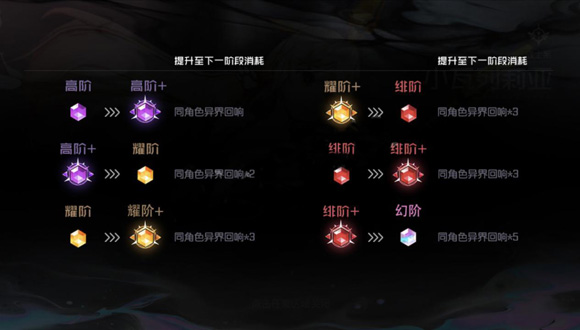 品階需要通過(guò)消耗相關(guān)角色的異界回響或品質(zhì)卡(多次重復(fù)獲取角色獲取),對(duì)角色進(jìn)行升階。