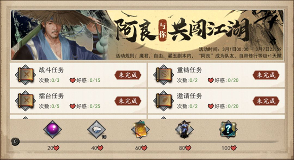 同時(shí)在本次活動(dòng)中還存在著一系列的活動(dòng)任務(wù),玩家在游戲中只要完成相應(yīng)的任務(wù)就可以獲得【角色好感度】,當(dāng)前【角色好感度】達(dá)到指定數(shù)值的時(shí)候即可獲得到指定的活動(dòng)獎(jiǎng)勵(lì),其中最高的獎(jiǎng)勵(lì)就是阿良的角色卡*1!