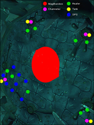 與瑪瑟里頓的戰(zhàn)斗包含3個階段,其中第一階段是最難的,后面的兩個階段僅需要簡單地按攻略完成就可以了。在進入瑪瑟里頓的房間之前,我們注意到瑪瑟里頓處在房間的中央,被5個地獄火導魔者放逐并監(jiān)禁起來,這些導魔者的位置圍繞成環(huán)狀,分別處在南邊、西南邊、東南邊、西北邊和東北邊。我們可以進入房間并隨意站位,這不會引到那些導魔者們,除非你對他們施放了攻擊技能或魔法。一旦導魔者們被激活,在瑪瑟里頓重獲自由(即進入第二階段)之前,我們有2分鐘的時間。當瑪瑟里頓的血達到30%時,進入第三階段。
