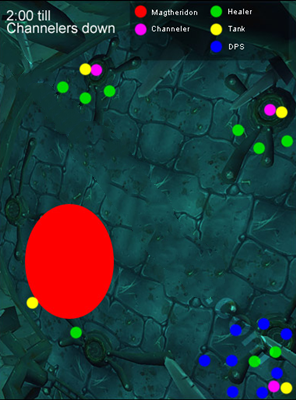 由于火焰新星有1分鐘的CD,所以需要制定一個控制鏈,每個方盒分配4個玩家。當?shù)谒膫€火焰新星被打斷后,控制鏈中的第一個玩家的“心靈疲憊”Debuff也已消失,所以他可以去控制第五個火焰新星。這個控制鏈在第二和第三階段要一直循環(huán)直到瑪瑟里頓死掉??刂奇溡还残枰?0人參與,5個方盒,每個方盒分配4人。除去MT,還剩下4人沒有分配,這4人可以作為替補,代替死掉的玩家進行控制。如果有5個或更多的玩家死掉,這將幾乎不可能打斷火焰新星,最終導致團滅,除非瑪瑟里頓生命值很低,可以在火焰新星之前被干掉。使用戰(zhàn)斗復活和在那些可能死掉的人身上綁靈魂石是不錯的方法。