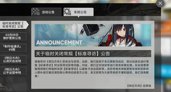 明日方舟3月9日關(guān)于臨時(shí)關(guān)閉常規(guī)【標(biāo)準(zhǔn)尋訪】公告