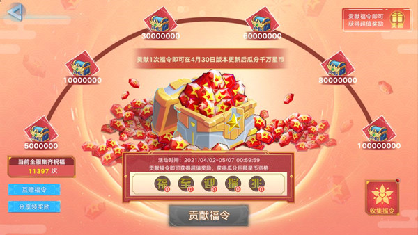 3、收集福令期間,貢獻(xiàn)過(guò)一次或以上福令,即可在4月30日更新后,進(jìn)入活動(dòng)界面,即可參與瓜分千萬(wàn)星幣,快來(lái)參與活動(dòng)吧~