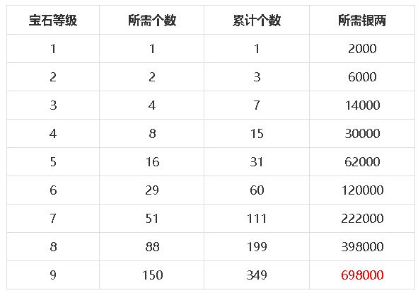 以下銀兩消耗僅計算每個寶石的最初價格2000銀子/個,隨著人物等級提升,寶石的價格會越來越高,1個寶石升到9級需要將近70萬銀子,具體升級所需個數(shù)和銀兩如下表: