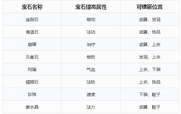 目前游戲內(nèi)一共有8種寶石,它們分別是金剛石、海藍石、翡翠、孔雀石、瑪瑙、貓眼石、珍珠、紫水晶,其中并沒有提高封印強化的寶石。人物裝備一共6個部位,它們分別是武器、發(fā)冠、上衣、下裝、飾品、鞋子。而每個部位能鑲嵌的寶石也是有所區(qū)別的,具體如下圖所示: