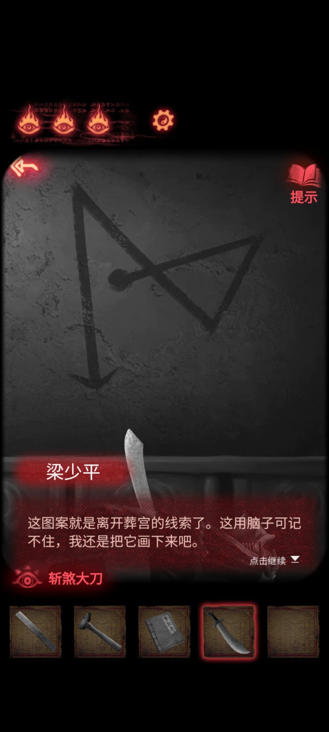 再回有大到房間,在大刀下放銅鏡、玉如意、面具,得斬煞大刀。出來,房塌了。