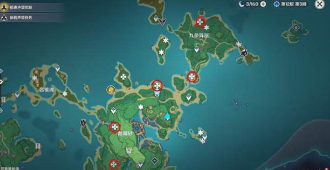 玩家在找找到女巫接取醫(yī)櫻任務(wù)后,需要按照下圖標(biāo)志的五個(gè)地點(diǎn)來(lái)尋找雷櫻樹(shù)并觸發(fā)機(jī)關(guān)。玩家只要到雷櫻樹(shù)旁邊開(kāi)啟元素視野,地面上會(huì)出現(xiàn)一個(gè)艷光圈,站在光圈內(nèi)等待落雷或者直接使用雷元素攻擊就可以觸發(fā)了。
