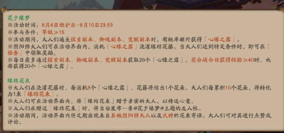 1、在活動(dòng)期間,玩家每日完成花合戰(zhàn)中的每日任務(wù),當(dāng)日花合戰(zhàn)經(jīng)驗(yàn)≥40時(shí)可獲得20個(gè)「心緣之露」道具。