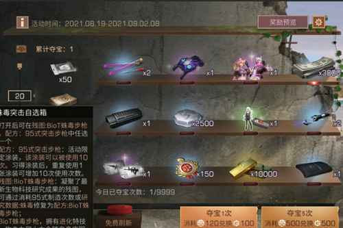 幸運奪寶:8月19日-9月2日8點,消耗集訓(xùn)獎牌可兌換100新幣并獲贈1次奪寶機(jī)會,有機(jī)會獲取蛛毒突擊步槍配方、青鳥號背包等道具;