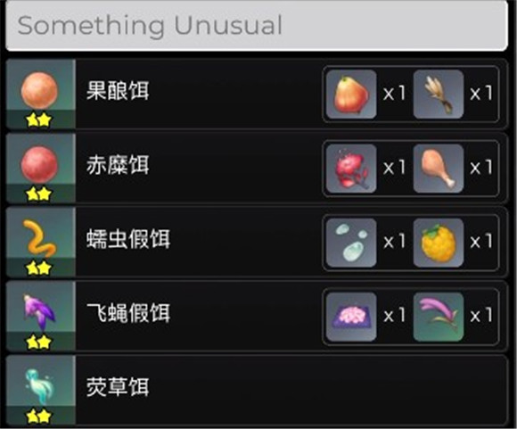 1、目前2.1版本上線了5種魚餌,分別是果釀餌、赤糜餌、蠕蟲假餌、飛蠅假餌以及熒草餌。