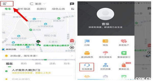 1、打開(kāi)曹操出行APP,進(jìn)入主頁(yè)后,向右滑動(dòng)屏幕或者點(diǎn)擊左上角的菜單按鍵,此時(shí)會(huì)使彈出伸縮界面,在伸縮界面點(diǎn)擊“在線(xiàn)客服”。