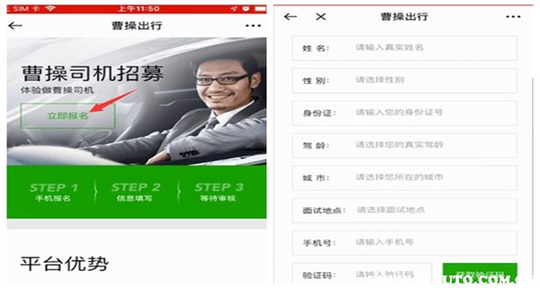 3、點(diǎn)擊立即報(bào)名,進(jìn)入信息填寫(xiě)界面后,根據(jù)提示填寫(xiě)姓名、性別、身份證、駕齡、面試地點(diǎn)、手機(jī)號(hào)碼等信息,然輸入收到的手機(jī)驗(yàn)證碼,點(diǎn)擊“提交”。