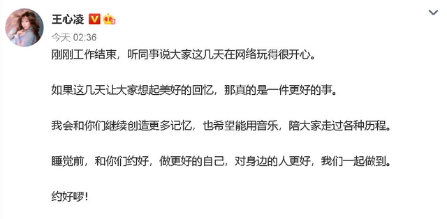 于是王心凌重回?zé)崴眩l(fā)不少關(guān)注。對(duì)于自己的再次爆紅,王心凌發(fā)文回應(yīng):“聽(tīng)同事說(shuō)大家這幾天在網(wǎng)絡(luò)玩得很開(kāi)心。如果這幾天讓大家想起美好的回憶,那真的是一件更好的事。我會(huì)和你們繼續(xù)創(chuàng)造更多記憶,也希望能用音樂(lè),陪大家走過(guò)各種歷程。”