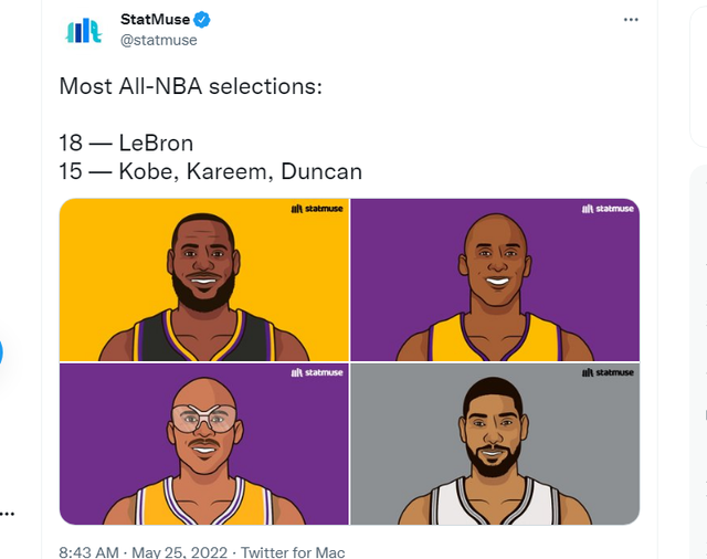 據(jù)統(tǒng)計,詹姆斯是NBA歷史入選最佳陣容次數(shù)最多的球星,高居歷史第1。科比、鄧肯、賈巴爾同為15次,并列第二。