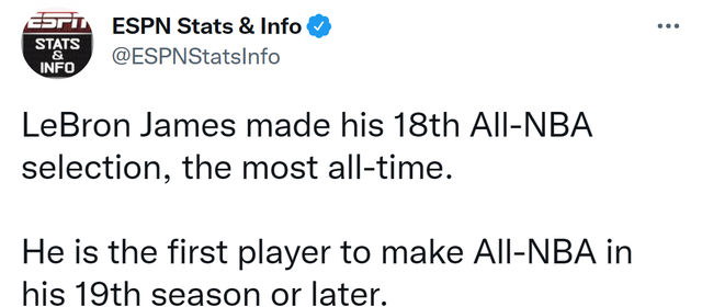 第1,數(shù)據(jù)統(tǒng)計顯示,這是詹姆斯第18次入選最佳陣容,他也是NBA史上首位在生涯第19個賽季(或更晚)仍能進入最佳陣容的球員。