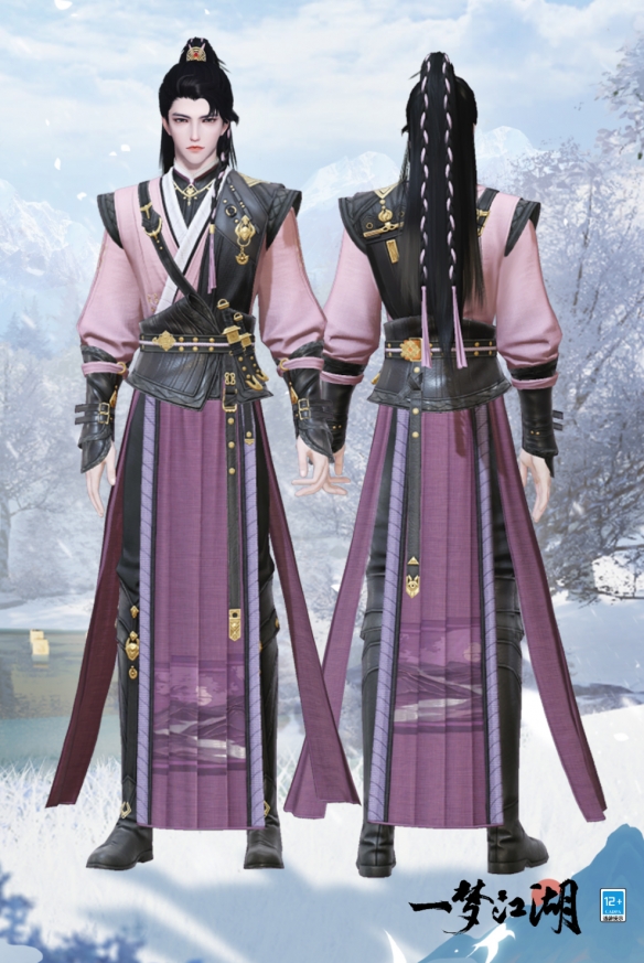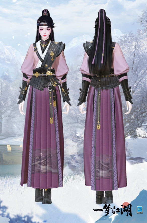 戍衛(wèi)邊關(guān)的成女少俠也用紫色編繩束起秀發(fā),柔美的粉紫色搭配闊挺勁爽的版型,更有種剛?cè)岵?jì)的干練爽利,像個(gè)身手矯健,武藝不凡,同時(shí)又心懷天下的女俠。
