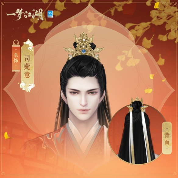 男款頭飾以海藍(lán)色寶石為發(fā)冠中心,發(fā)冠四周鑲著金色葉片,金色與白色緞帶于身后隨風(fēng)飛揚(yáng),翩翩公子佩戴更顯得清雅俊逸。