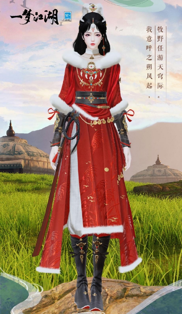 成女少俠的主色調(diào)則是明艷大氣的紅色,赤色裙袍搭配著潔白的皮毛,精致的金飾與狼牙飾品、皮革護(hù)腕、腰封的相輔相成,為這位草原公主增添了幾分颯爽與英氣。