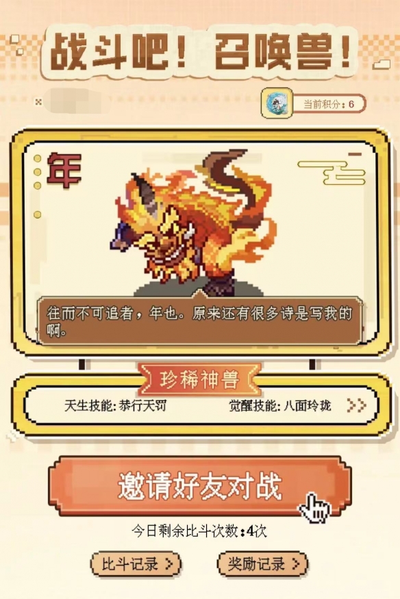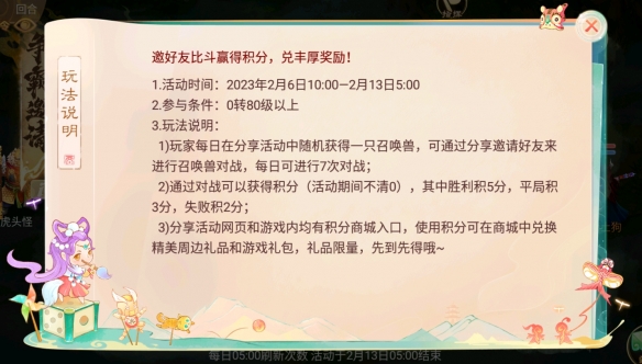2023年2月6日10:00-2月13日5:00期間,俠士在分享活動中綁定游戲角色后,每日登錄活動頁面就可隨機獲得一只召喚獸,召喚獸包含普通-高級-特殊-神獸-珍稀五種隨機的品級。(H5活動比斗為隨機勝負,與每日所獲取的召喚獸品級無關(guān))