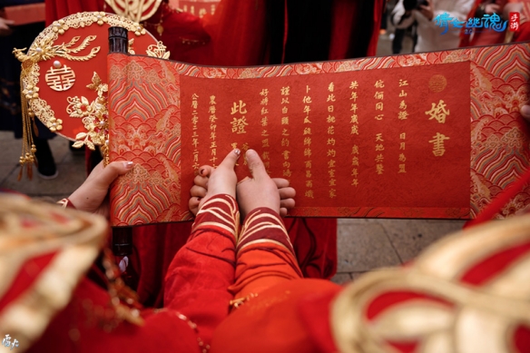 新人們從秦淮河畔的酒店出發(fā),來到夫子廟大成殿孔子像前舉行首個儀式【三拜圣人】。白衣贊者作為主婚人介紹游船婚禮起源后贊頌“江山為證,日月為盟,滄桑未改其志,風月不移其情,共年年歲歲,歲歲年年。”同時倩女官方還以游戲內(nèi)同款贊詞為新人定制了獨一無二的浪漫婚書。三拜圣人后,新人們在定制手寫婚書上蓋下指印,良緣永結(jié)。