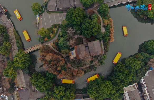 拜別大成殿的賓客后,新人們在泮池碼頭登上布滿紅綢錦緞的游船,在白衣琴師與紅衣刀客的帶領(lǐng)下,他們伴隨著岸上游人祝福的目光中開啟了一段水上巡游之旅。新人們乘坐的畫舫在秦淮河上巡游,新人雙雙立于船頭,向賓客致禮,傳遞著幸福的喜悅。沿途的橋上就成為了最佳的觀賞和拍照點,金釵鈿合、衣袂翩躚,夢幻華麗的婚服與湖面掩映生姿。