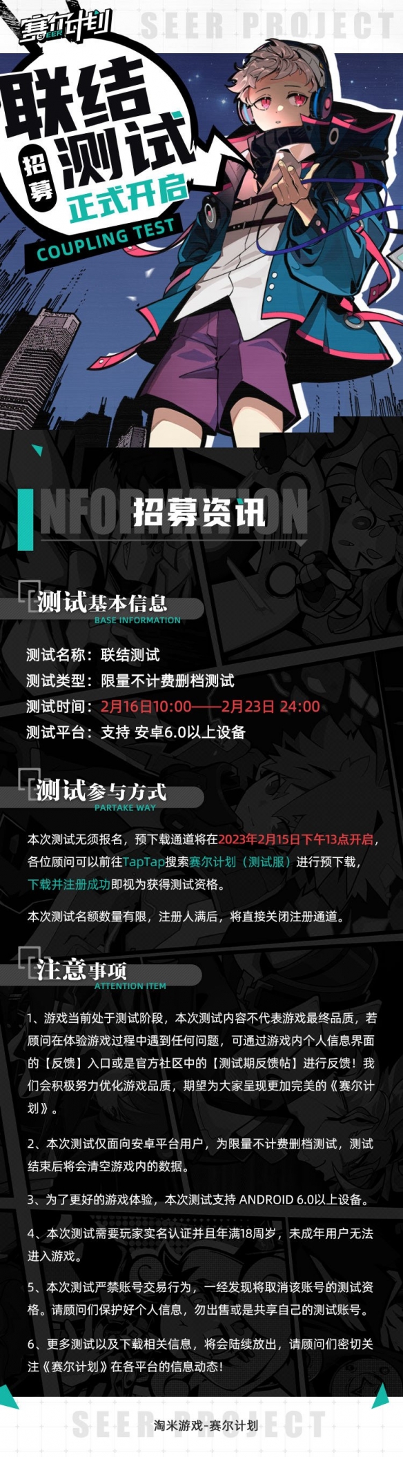 本次測(cè)試時(shí)間為2023年2月16日10:00 - 2023年2月23日24:00,測(cè)試類型為安卓限量不計(jì)費(fèi)刪檔測(cè)試;本次測(cè)試無(wú)須報(bào)名,預(yù)下載通道將在2023年2月15日下午13點(diǎn)開啟,各位顧問(wèn)可以前往TapTap搜索《賽爾計(jì)劃》進(jìn)行預(yù)下載,下載并注冊(cè)成功,即視為獲得測(cè)試資格。