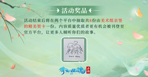 玩家參與【呼喚你的名字】活動(dòng)分享昵稱故事后,倩女手游將在兩個(gè)平臺(tái)中抽取共8份由開發(fā)組親筆簽繪的精美賀卡,并根據(jù)你與你cp的職業(yè)獨(dú)家定制!這份專屬禮物不僅儀式感滿滿,同時(shí)也承載著倩女手游美術(shù)組對(duì)玩家們真摯感情的美好祝愿!你與TA獨(dú)一無二的經(jīng)歷還有幾率被刊登至官方平臺(tái),讓三界更多人傾聽到你們的故事!