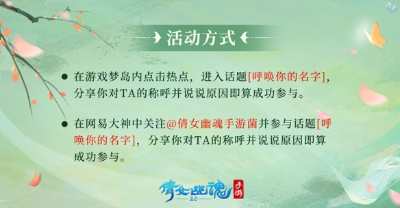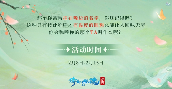 全新活動(dòng)【呼喚你的名字】浪漫來襲!TA可能是你的俠侶,或是你的結(jié)拜,你們也許相伴至今,又或許曾在某個(gè)岔路分道揚(yáng)鑣。但TA曾與你朝夕相處、促膝談心,陪伴你走過一段難忘的歲月。那這個(gè)被你常常掛在嘴邊、永遠(yuǎn)率先想起的名字是什么呢?大家的專屬昵稱可能甜蜜美好,亦或是搞怪有趣,其中定然蘊(yùn)藏著彼此間一段難以忘懷的小確幸!