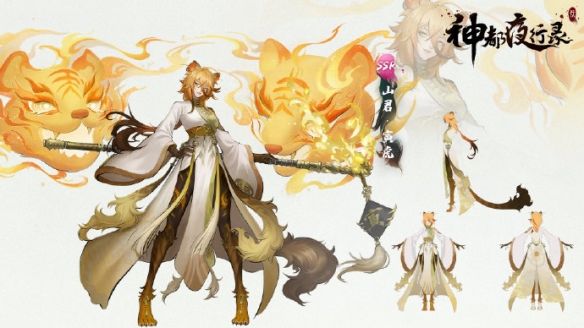 山君·寅虎身量修長(zhǎng),一襲白底金紋長(zhǎng)袍隨性半披,露出內(nèi)里的金色甲胄;長(zhǎng)袍和玉背上,虎紋赫然在目,隱約可見猛虎奔騰,踏云逐日;翹亂秀發(fā)下,金瞳炯炯有神,一對(duì)虎耳敏銳地捕捉著敵人的細(xì)微舉動(dòng);腰間的虎頭配飾造型古樸,垂落的虎尾流蘇英氣非凡。