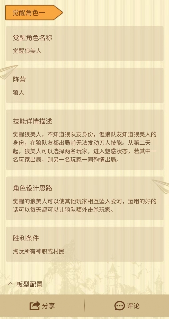 整體板子將覺醒狼美人的技能特點發(fā)揮到了極致,讓她一人成為該板子的制勝關鍵點,雖然技能本身并不復雜,但在整體的游戲策略上無疑是非常出色的,同時該板子及角色設計將被狼人殺官方收入庫中。