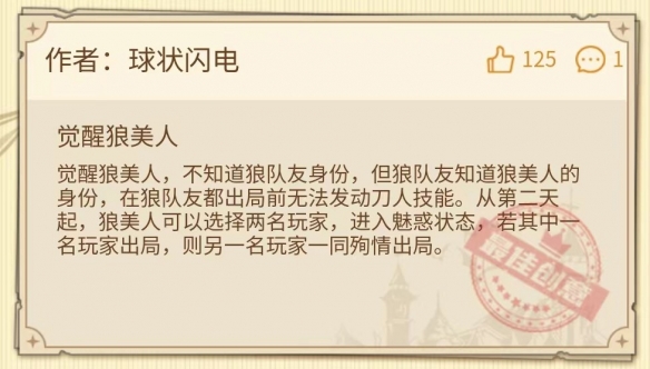在經(jīng)過了層層篩選后,最終作者球狀閃電設計的“覺醒狼美人”成功脫穎而出,獲得了本次設計大賽的最佳創(chuàng)意獎。該角色的設計思路為覺醒狼美人可在每晚選擇兩名玩家進入魅惑狀態(tài),若其中一方出局,則另外一名玩家會隨之殉情出局;板子配置中包括了預言家、女巫、騎士和覺醒愚者,狼人陣營則是以覺醒狼美人為主導。