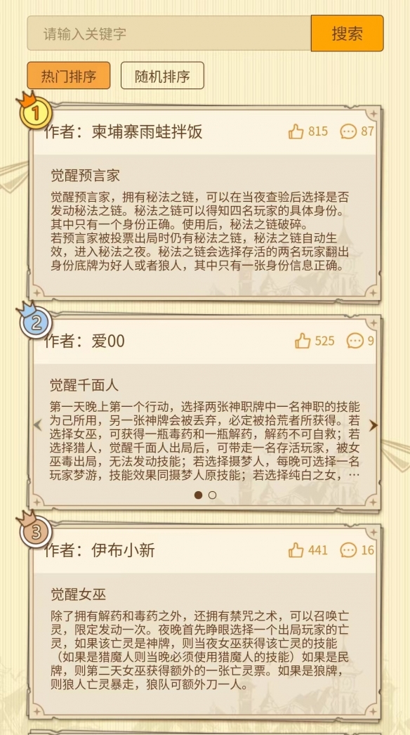 在本次覺醒角色設計大賽中,累計收到了近千份玩家投稿,全平臺投票總數(shù)達6000多票,單平臺討論量700余條。玩家們在狼人殺原有角色的基礎上,發(fā)揮出了無限創(chuàng)意,為包括女巫、預言家在內(nèi)的眾多游戲角色都設計出了他們的專屬覺醒技能,并以此衍生出了復雜且極具可玩性的多個游戲板子。