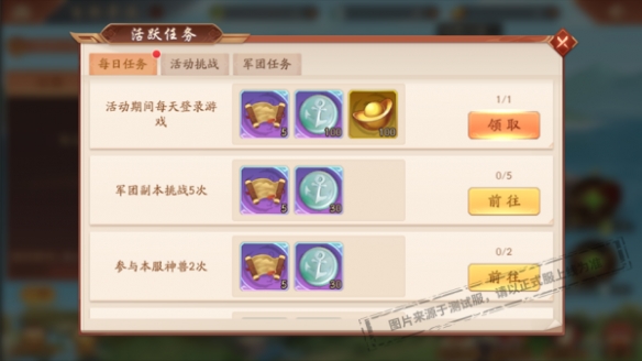 活動(dòng)期間,少年們每日完成軍團(tuán)副本、神獸挑戰(zhàn)、兵臨城下、定軍山、書樓爭魁、巔峰競技場、紅顏出游等活躍任務(wù)均可獲取航海圖和銀石錨幣獎(jiǎng)勵(lì);累計(jì)完成活動(dòng)挑戰(zhàn)和軍團(tuán)任務(wù)可獲取司南、航海圖、金玉錨幣和銀石錨幣獎(jiǎng)勵(lì)。