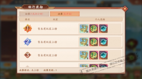 排行榜分為初賽排行和決賽排行,初賽排行在第2天24點(diǎn)結(jié)束,決賽排行在第3天24點(diǎn)結(jié)束,有意爭奪排名獎(jiǎng)勵(lì)的少年請注意活動(dòng)時(shí)間。