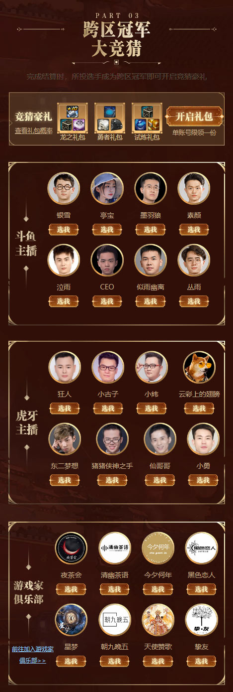 本次大賽同時(shí)設(shè)置了投票競(jìng)猜活動(dòng)。參與活動(dòng)的勇士們除了自己報(bào)名參賽,還可競(jìng)猜各位平臺(tái)主播、大神誰將獲得其所在的跨區(qū)第一,競(jìng)猜成功的勇士可獲得禮包獎(jiǎng)勵(lì),有機(jī)會(huì)開出+10裝備增幅券哦。