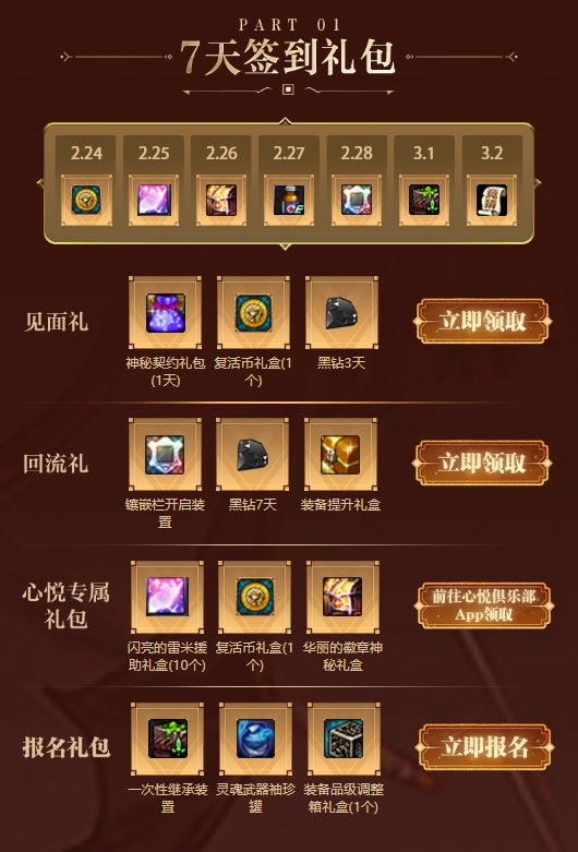 現(xiàn)在報(bào)名,除了有機(jī)會(huì)領(lǐng)取報(bào)名禮包,還有見面禮、7天簽到禮包等獎(jiǎng)勵(lì)等著各位,每天領(lǐng)取對(duì)應(yīng)禮包獎(jiǎng)勵(lì),助力勇士們刷新裝備、歐氣傍身,更快、更強(qiáng)地通關(guān)各大地下城!