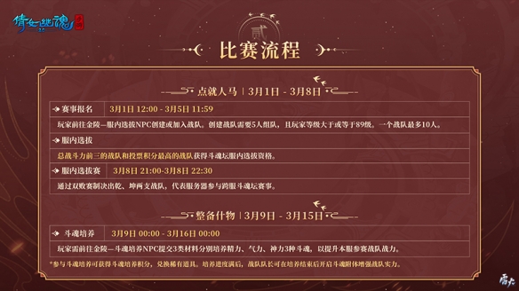 3月8日將進行服內(nèi)選拔賽,投票積分第一的戰(zhàn)隊和總戰(zhàn)斗力前三的戰(zhàn)隊,將獲得服務(wù)器內(nèi)選拔資格。各參賽服務(wù)器將選拔出乾、坤兩隊代表本服出戰(zhàn)!3月9日-15日斗魂培養(yǎng),提升本服參賽戰(zhàn)隊?wèi)?zhàn)力;3月18日-19日跨服對戰(zhàn)正式開啟。倩女手游邀你加入這場絕妙的PK盛宴,共逐榮耀!