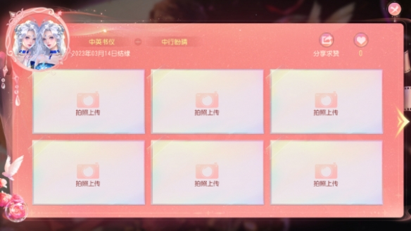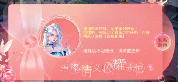 結(jié)緣的才子佳人可攜手同游長(zhǎng)安城內(nèi)外繁華風(fēng)景,賞大好河山,并拍照留念。達(dá)到20級(jí)的結(jié)緣雙方將可開啟玫瑰相簿。相簿一頁有六個(gè)可供擺放照片的格子,結(jié)緣愛侶們可將拍下的照片上傳在相簿中,共存節(jié)日紀(jì)念。達(dá)成玫瑰之約的結(jié)緣情侶將獲得永久玫瑰相簿道具,并且還將獲得大量代幣花瓣用以兌換花瓣商店獎(jiǎng)勵(lì)。