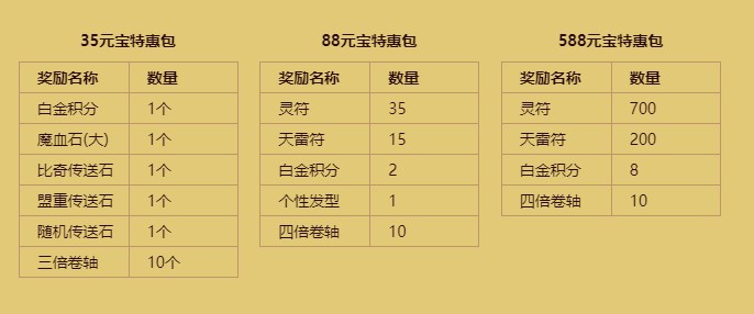 新區(qū)開放伊始,即可于盟重省NPC“活動(dòng)使者”處分別使用35元寶、88元寶、588元寶購買新手特惠包 ,每個(gè)角色每種特惠包只限購買一個(gè),特惠包及包中的道具均綁定角色,不可交易!