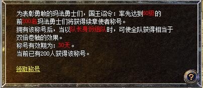 開區(qū)后,新區(qū)服務(wù)器中,前200名達(dá)到60級的勇士,將獲得續(xù)章使者稱號! 憑稱號獲組隊(duì)雙倍卷軸效果。